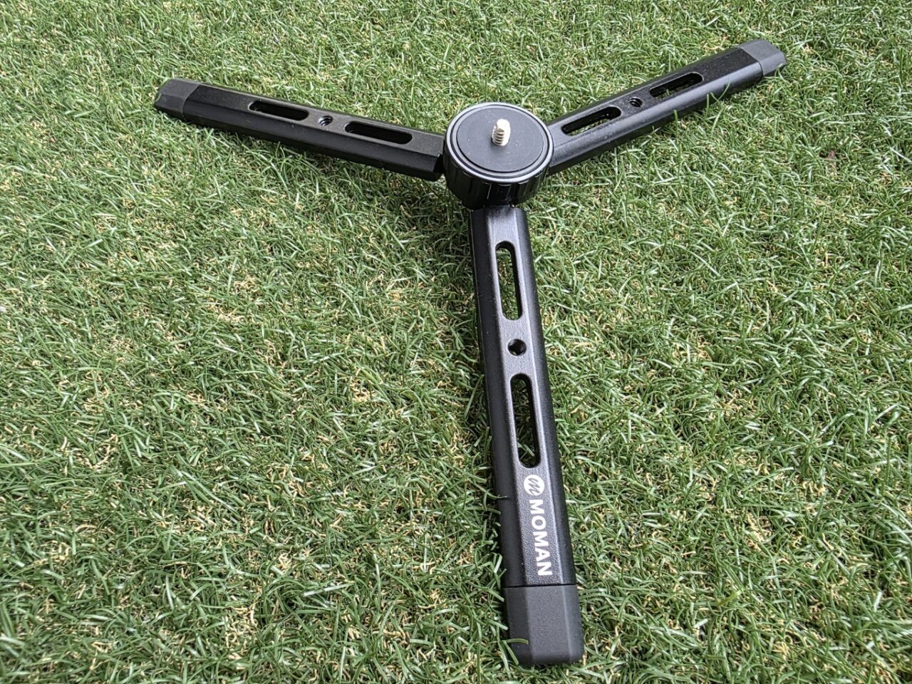 手のひらサイズのテーブル三脚です。高さは17.6cm、重さは190gと軽量で持ち運びも簡単です。三脚に長さがあるので、ぐらつきなく地面に置くことができます。(長さ重要です。)そして、3本の脚に1/4ネジ穴があり、カメラモニター、マイク、LEDライトなど、他の機材を取り付けるのがこの三脚のメリット。
